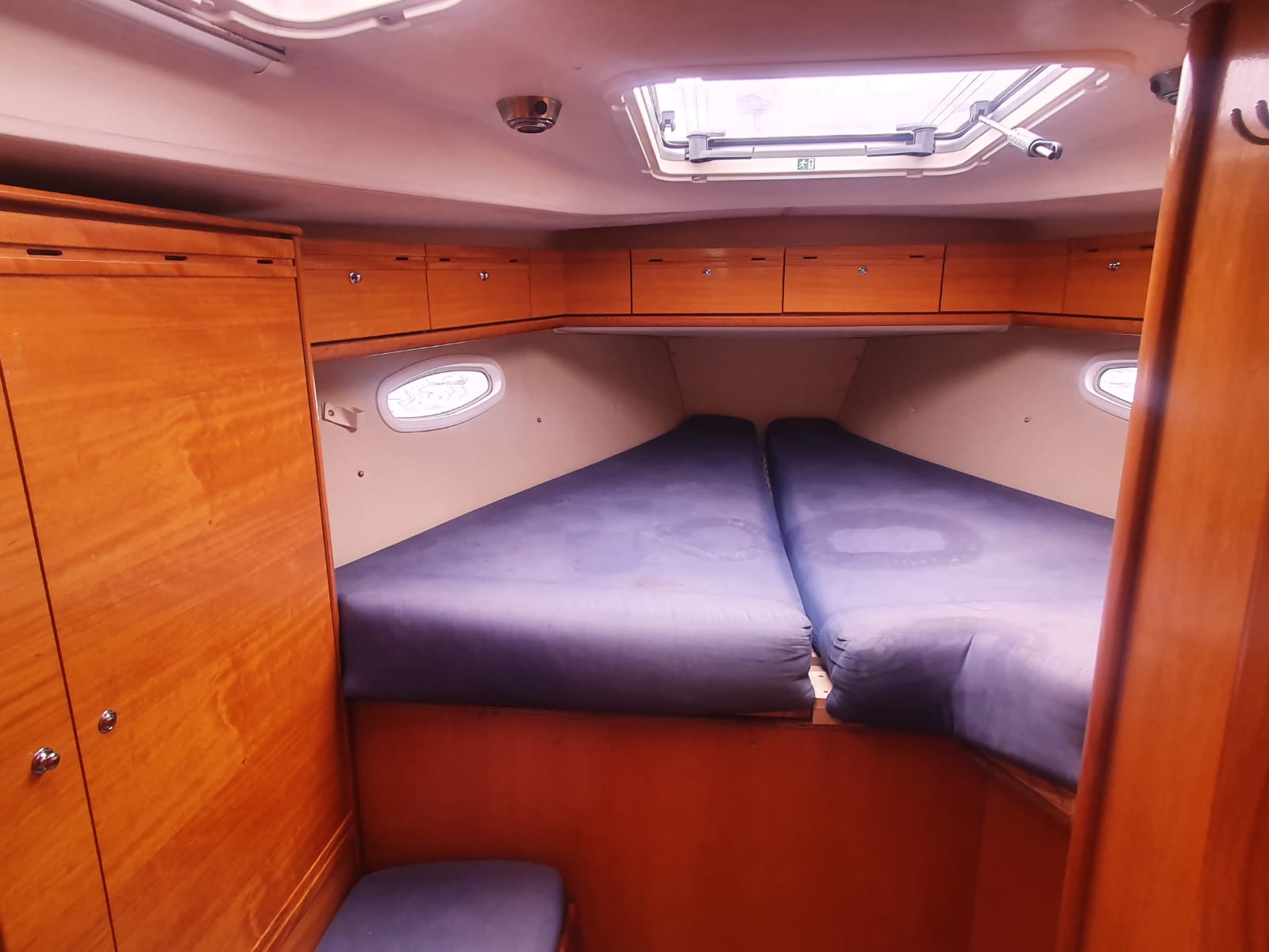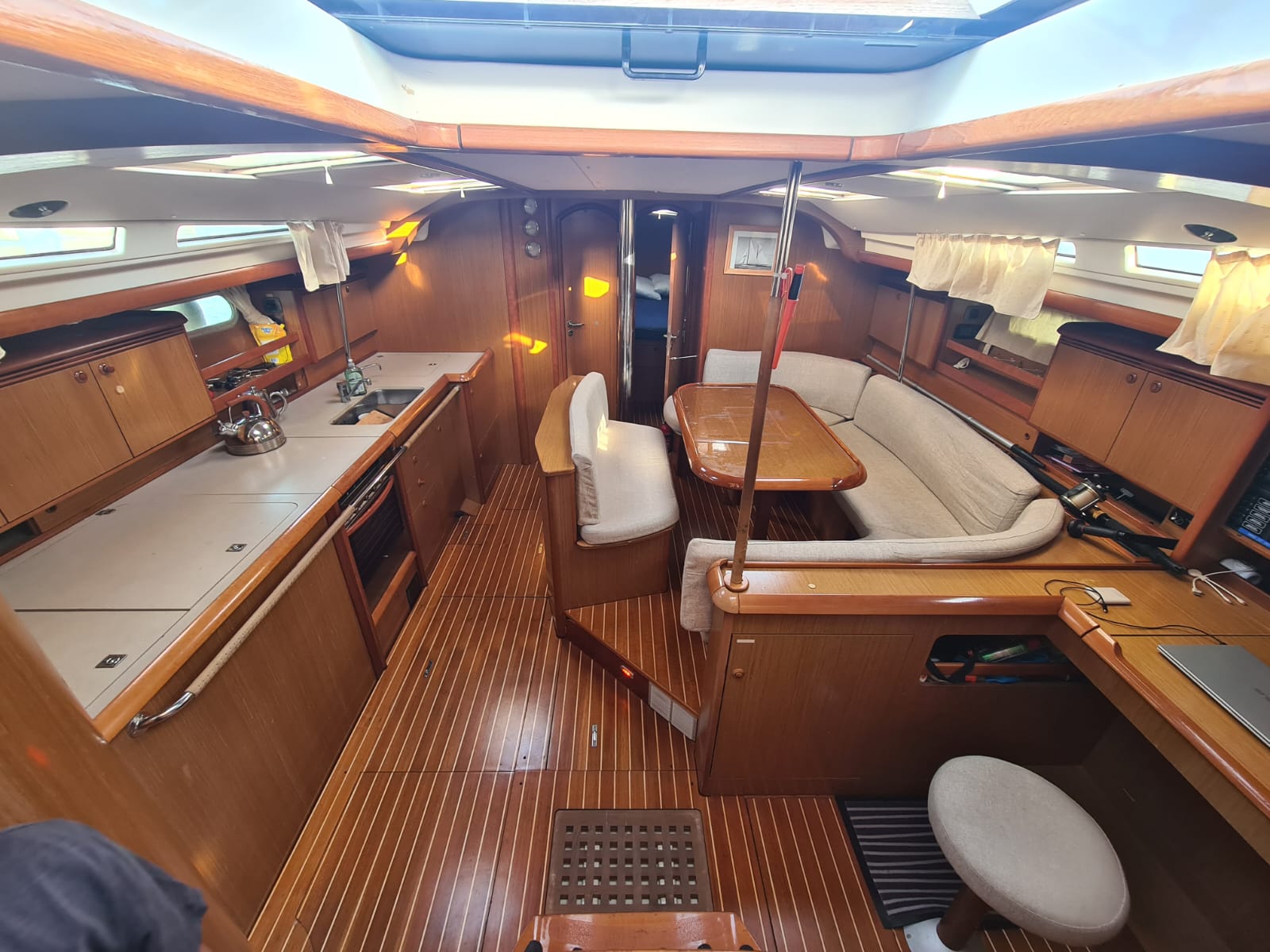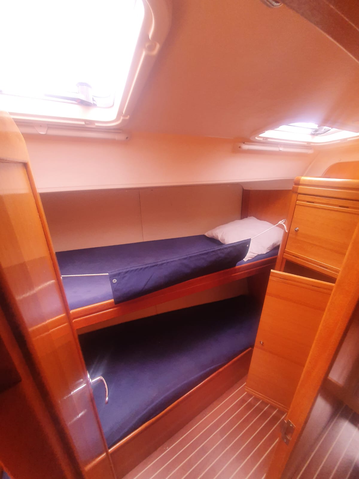 Il est composé d’un carré et d’une cuisine. Pour les passagers sont mises à disposition 5 cabines : 3 doubles et 2 twin (2 bannettes superposées)