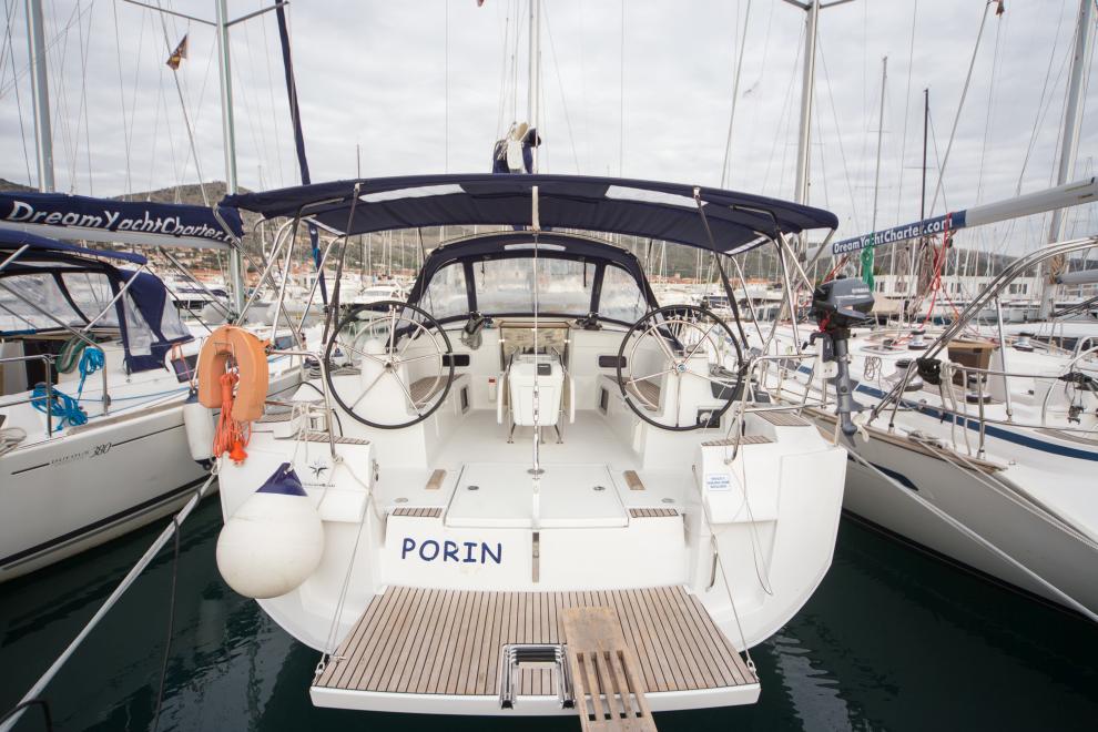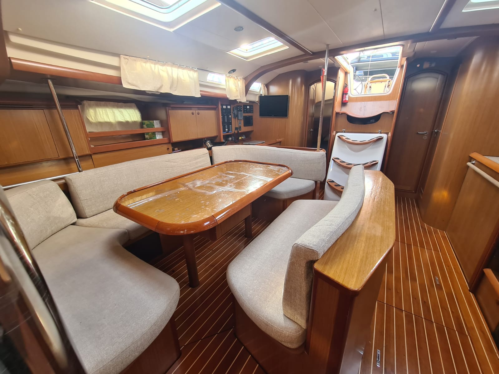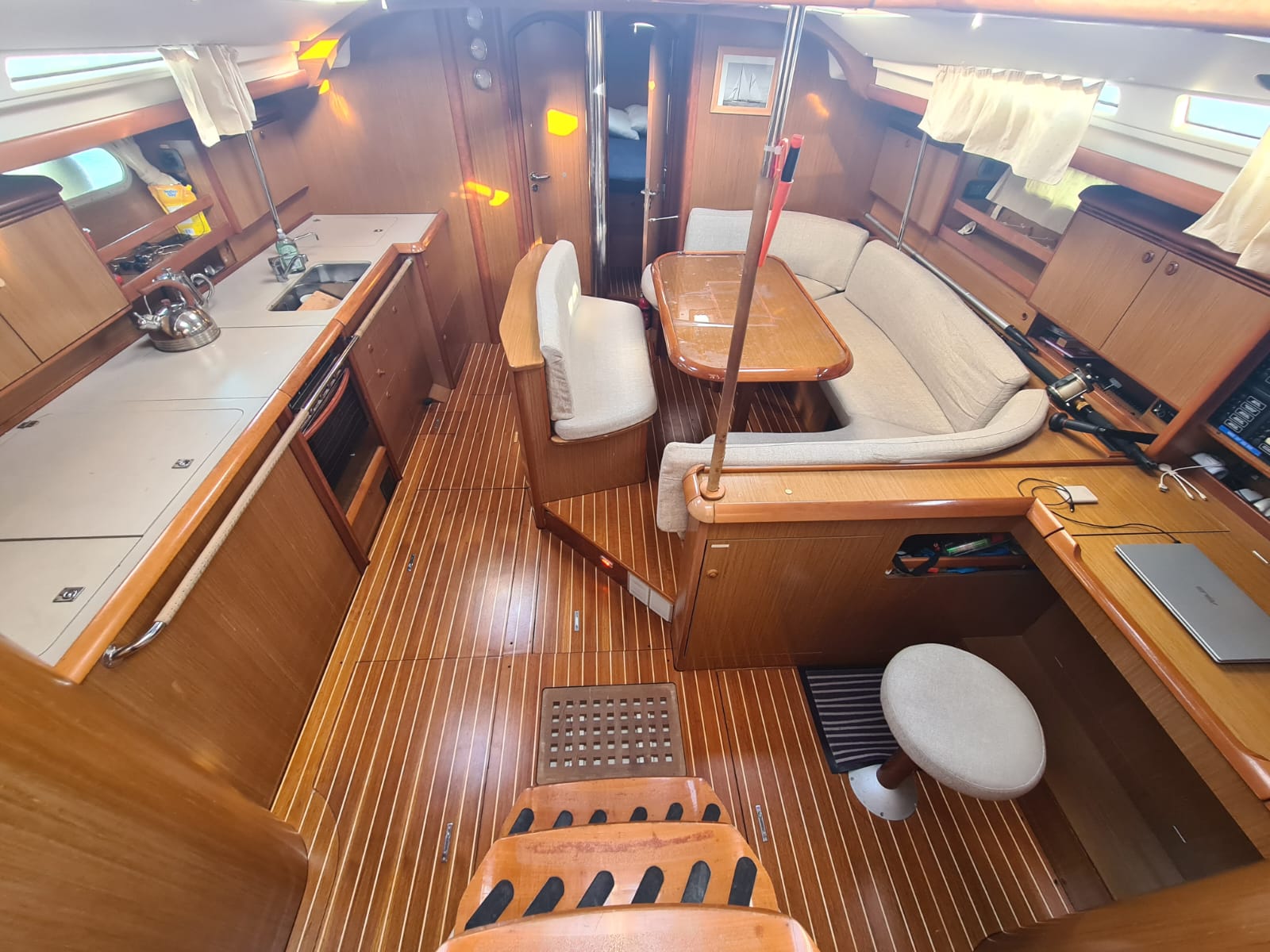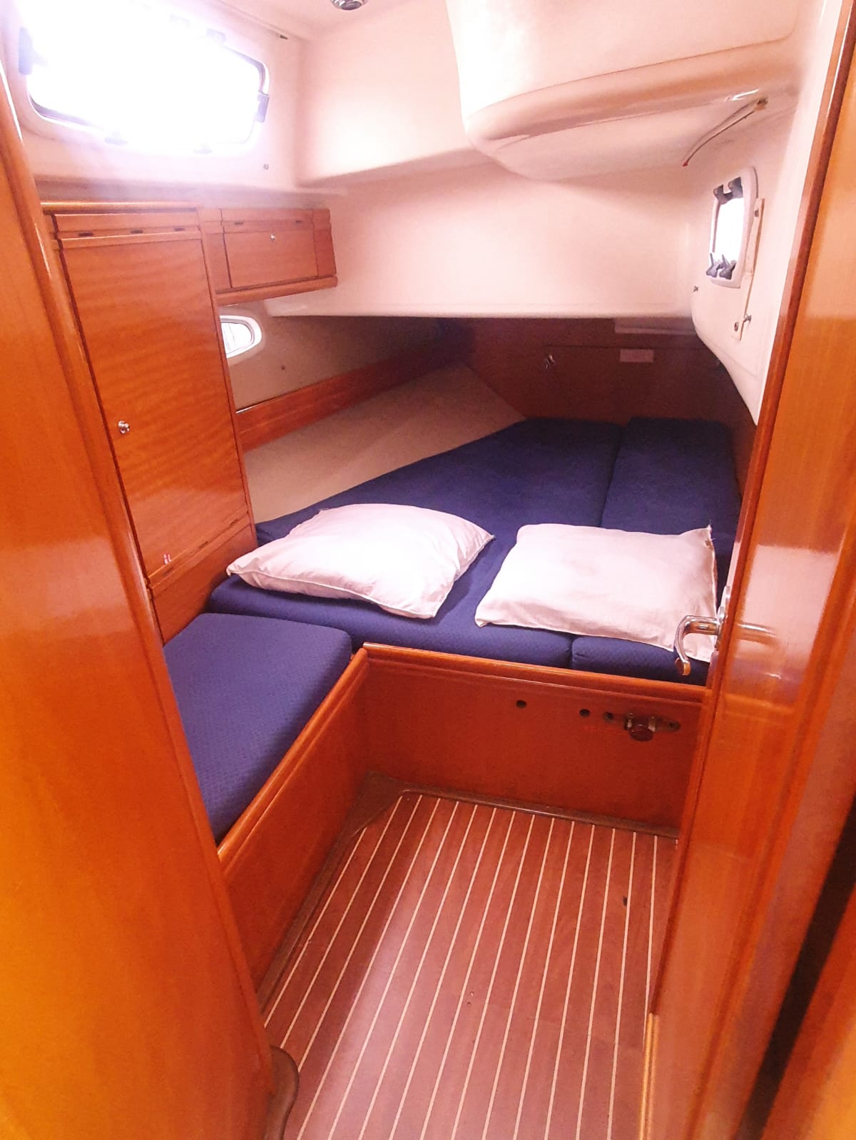 Il est composé d’un carré et d’une cuisine. Pour les passagers sont mises à disposition 5 cabines : 3 doubles et 2 twin (2 bannettes superposées)
